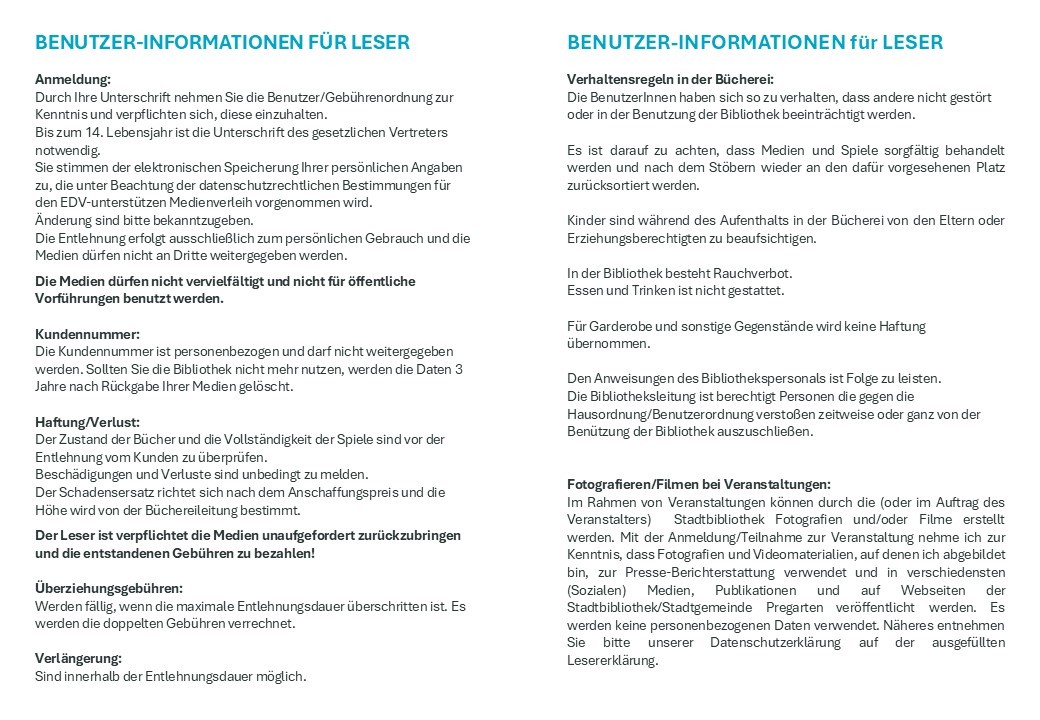 Alle Neuerwerbungen, den aktuellen Medienbestand der Stadtbibliothek Pregarten und Infos finden Sie unter www.biblioweb.at/pregarten.